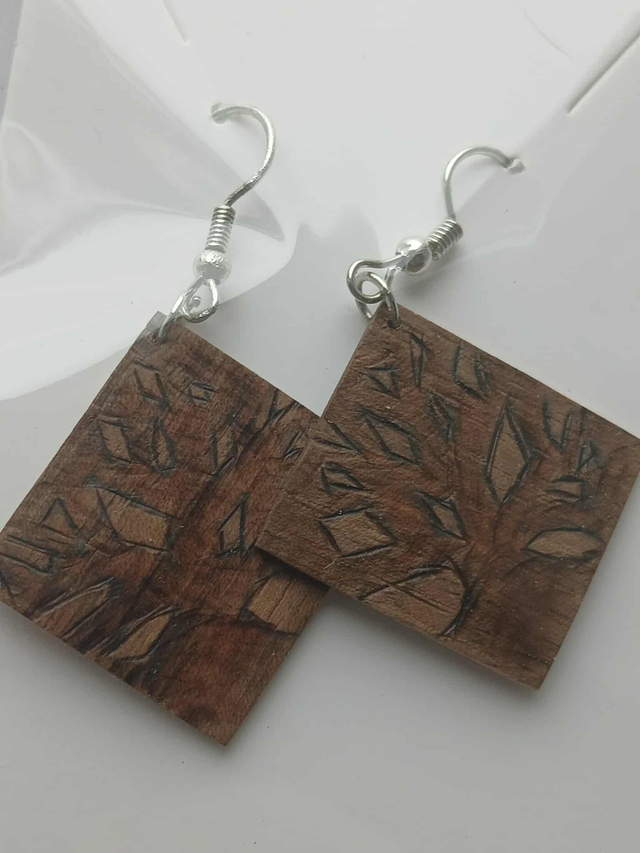 Boucles d’oreilles carrées en noyer pyrogravé – bijou artisanal en bois